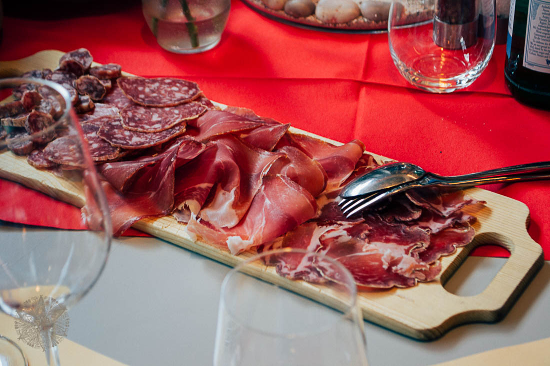 Als Vorspeise wurden toll angerichtet typische Spezialitäten aus der Emilia-Romagna wie Prosciutto di Parma, Mortadella aus Bologna IGT, Salami aus Felino, edle Käsevariationen aus Ziegen-, Schafs- und Kuhmilch mit Honig, Mostarda und Marmelade serviert.