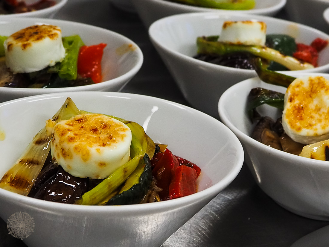 die Geladenen flanieren zu den verschiedenen Sitzgelegenheiten. Das Spielangebot für die Kinder zieht nicht nur die Kleinen an. Es ist ein wunderbarer Tag. Als die Hochzeitsgesellschaft sich für das Gruppenfoto einfindet, räumt Rico diskret mit seinem Team wieder auf. Das Servicepersonal lässt alles verschwinden, was auf die Tea Time schließen lässt. Sina und Matthias, Rico‘s Chef Logistiker, bringen die Heizpilze in Position, die Warmhaltebehälter für das Burger Buffet am Abend werden vorbereitet. In der Küche arbeitet das Team mittlerweile auf Hochtouren am Flying Buffet. Der Blick wandert immer wieder auf den Ablaufplan und die Menübausteine. Noch ist alles im Zeitplan, die Köche aus dem Dufner Catering Team teilen sich für die einzelnen Gerichte ein und so entstehen auf engem Raum Caesar Salad im Gläschen, Antipasti mit karamellisiertem Ziegenkäse, Melone mit Feta, Tapenade und Minzblättchen, Miniatur Lobster Roll und ein Süppchen von der Frankfurter Soße mit pochiertem Wachtelei. Hier gebe ich unumwunden und ehrlich zu, dass ich – also, als Nervennahrung sozusagen – eine ganze, öhm, Maxi Lobster Roll verdrücken durfte. Rico,… herrlich!
