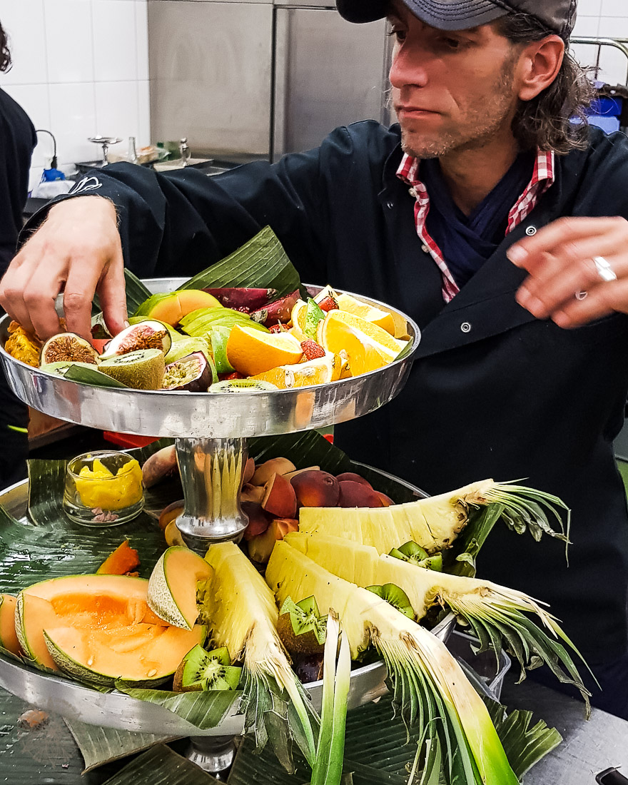 wird unter dessen die berühmte Tea Time von Rico‘s Köchen arrangiert. Genauer gesagt, die vielen köstlichen Häppchen vorbereitet und auf die Etageren drapiert. Es werden köstliche Sandwiches gestrichen, Brownies, Macarons, Eclaires verteilt. Die kleinen Tarteletts wandern noch heiß auf die Teller. Mini Cupcakes und frisch aufgeschnittenes Obst ergänzen das Angebot auf einer riesigen Etagere.