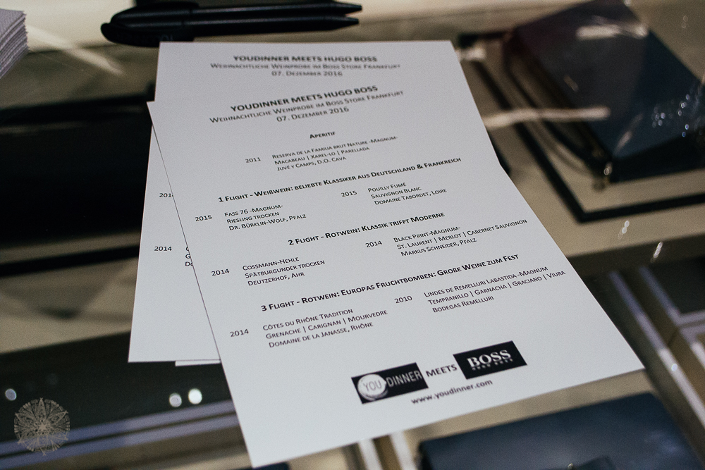 fand sich ein Teammitglied von YouDinner zusammen mit einem begnadeten Sommelier ein. In unserem Fall durften wir uns glücklich schätzen, Mathieu Müller, Sommelier im Tanica in Köln, kennen zu lernen. Beide Herren begleiteten, eine kleine und begeisterte Gästeschar, zusammen mit dem herzlichen und versierten Mitarbeiterteam des HUGO BOSS Stores, durch den Abend.