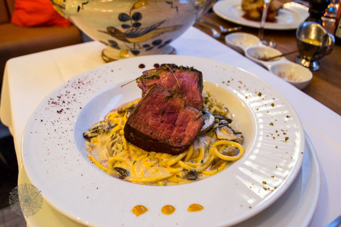 besteht für uns aus Tagliolini mit Champignon à la Crème, Parmesanschaum und darauf, unglaublich zart, aromatisch intensiv und perfekt auf den Punkt gegartes Filet vom Simmentaler Rind.