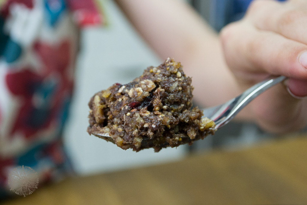 - Trockenfrüchte und Nüsse möglichst fein hacken und dann mit dem Wasser und Mandelmus so fein es geht pürieren. Wenn der Mixer raucht, ist es übrigens nicht gut!