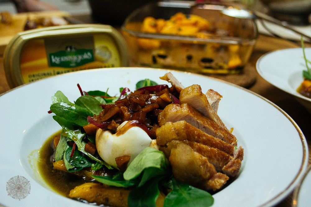 Iberico Schwein, Burrata und Salat mit lauwarmen Quittendressing