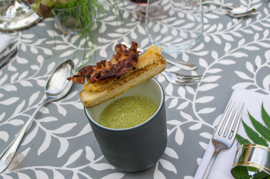 Nun kommt, in einem wunderbaren isolierenden Becher, die Suppe vom Kopfsalat mit einem Croûton Stäbchen, Parmesanchip und Bacon. Hach, soll ich da noch mehr dazu schreiben? Vertrau mir, eine Suppe vom Kopfsalat ist DER Hammer! Du kannst auch Feldsalat, Ruccola oder Endiviensalat verwenden. Es wird eine Lieblingssuppe werden, vor allem wenn Du sicher stellst, dass Du etwas Knuspriges zum Stippen hast. Und wenn Du den bacon weg lässt, oder ihn mit Gemüsechips ersetzt, hast Du ein tolles vegetarisches Rezept!