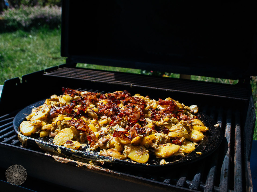 Den gewürfelten Taleggio und restliche BBQ Soße, unterheben und so lange bewegen, bis die Eier leicht hellbraun sind. Dazwischen ruhig mal den Grilldeckel schließen und mit den Schultern zucken, falls die Eiermasse überläuft,…